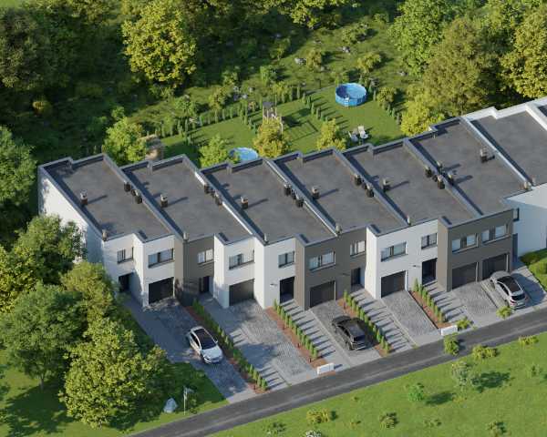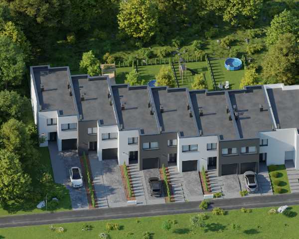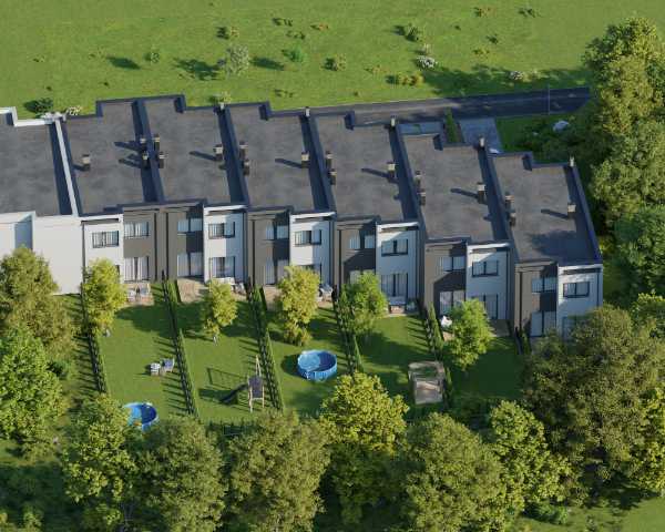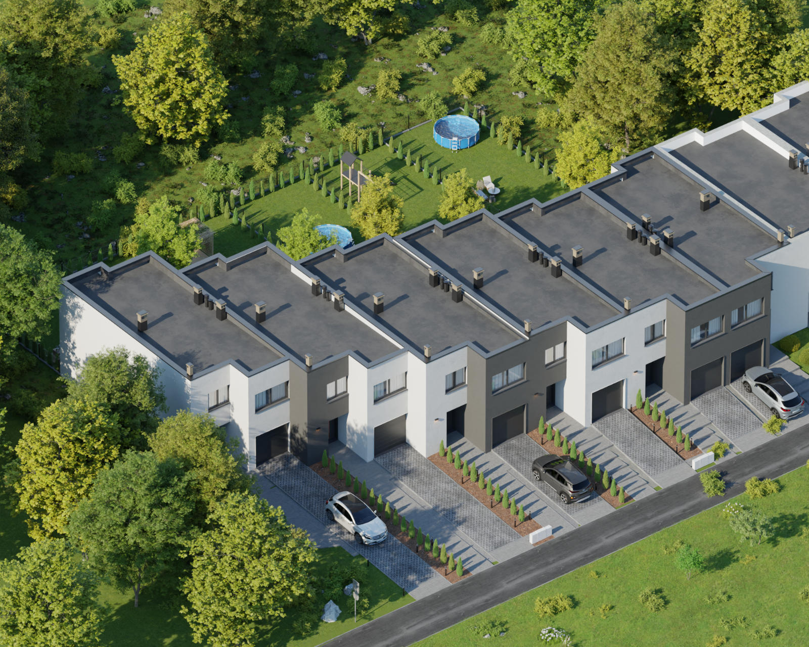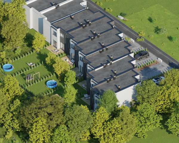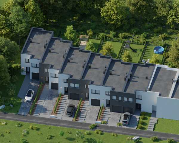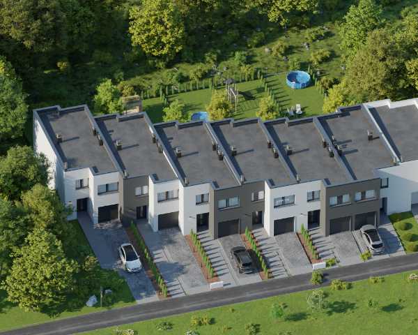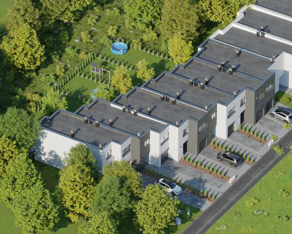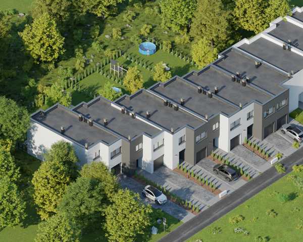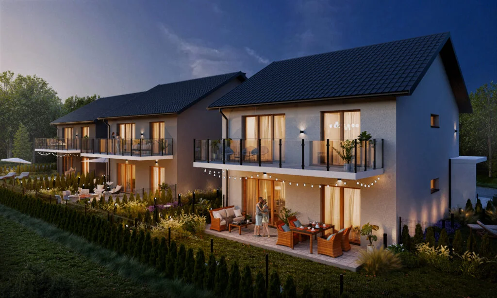 Na zewnątrz czeka na Ciebie prywatny ogródek z tarasem, gdzie zrelaksujesz się po pracy albo wypijesz kawę w weekendowy poranek. Do każdego lokalu przynależą miejsca postojowe, a teren wokół jest już gotowy do użytku – z ogrodzeniem, podjazdem i chodnikami w cenie. Dodatkowo możesz zainstalować klimatyzację, fotowoltaikę, rolety czy nawet system automatycznego nawadniania ogrodu. Co ważne, domy nie mają części wspólnych, więc nie płacisz za nic, z czego nie korzystasz. Tutaj od początku mieszkasz na własnych zasadach.
