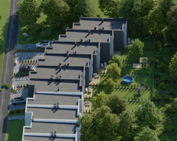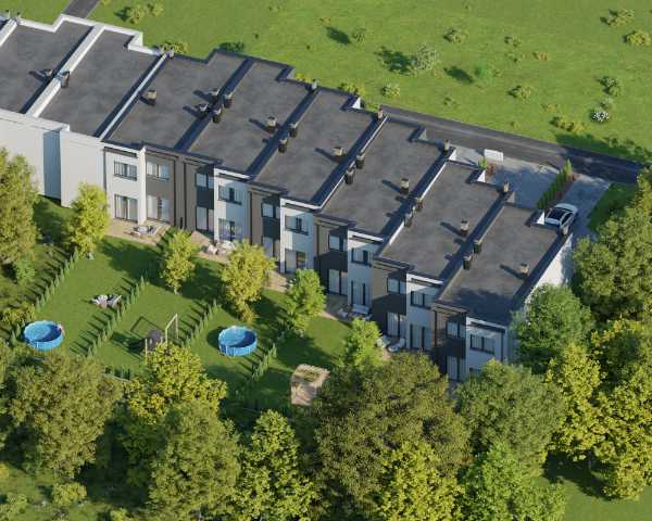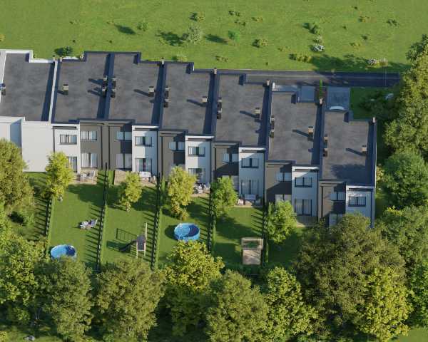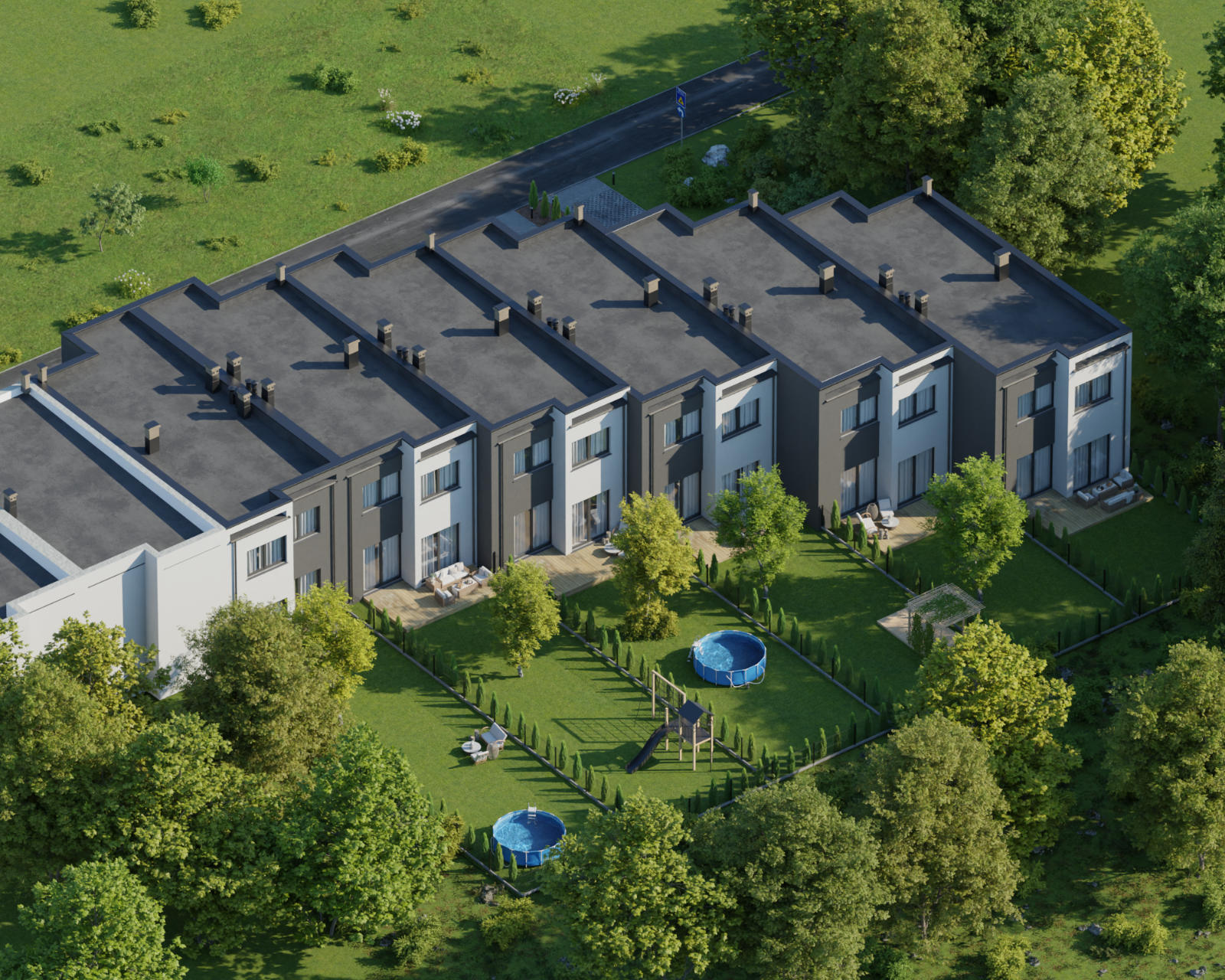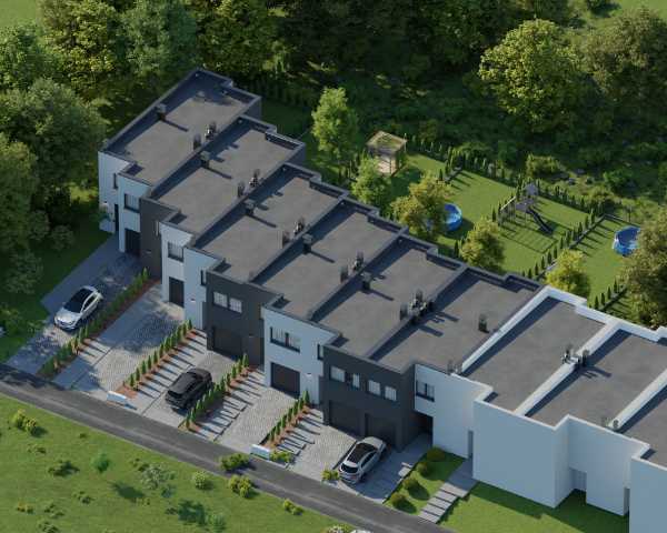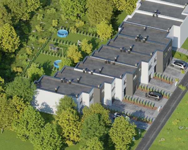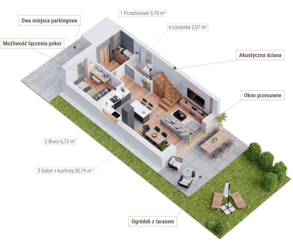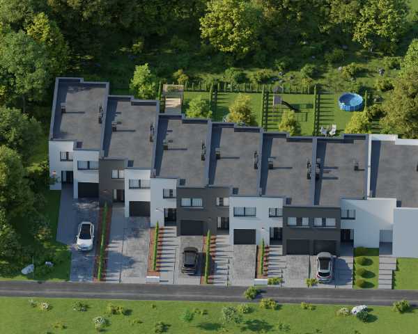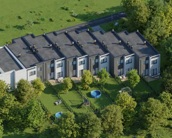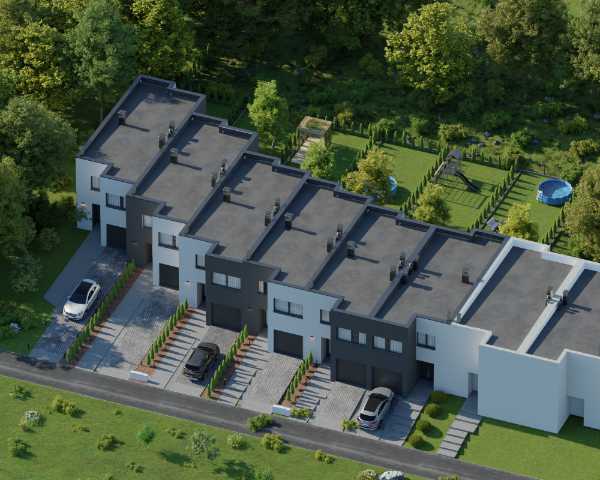 Na zewnątrz czeka na Ciebie prywatny ogródek z tarasem, gdzie zrelaksujesz się po pracy albo wypijesz kawę w weekendowy poranek. Do każdego lokalu przynależą miejsca postojowe, a teren wokół jest już gotowy do użytku – z ogrodzeniem, podjazdem i chodnikami w cenie. Dodatkowo możesz zainstalować klimatyzację, fotowoltaikę, rolety czy nawet system automatycznego nawadniania ogrodu. Co ważne, domy nie mają części wspólnych, więc nie płacisz za nic, z czego nie korzystasz. Tutaj od początku mieszkasz na własnych zasadach.