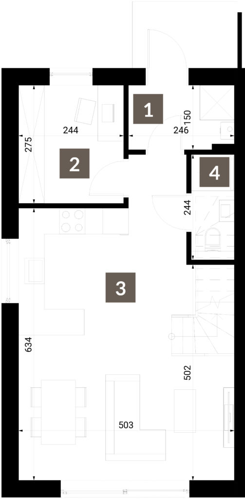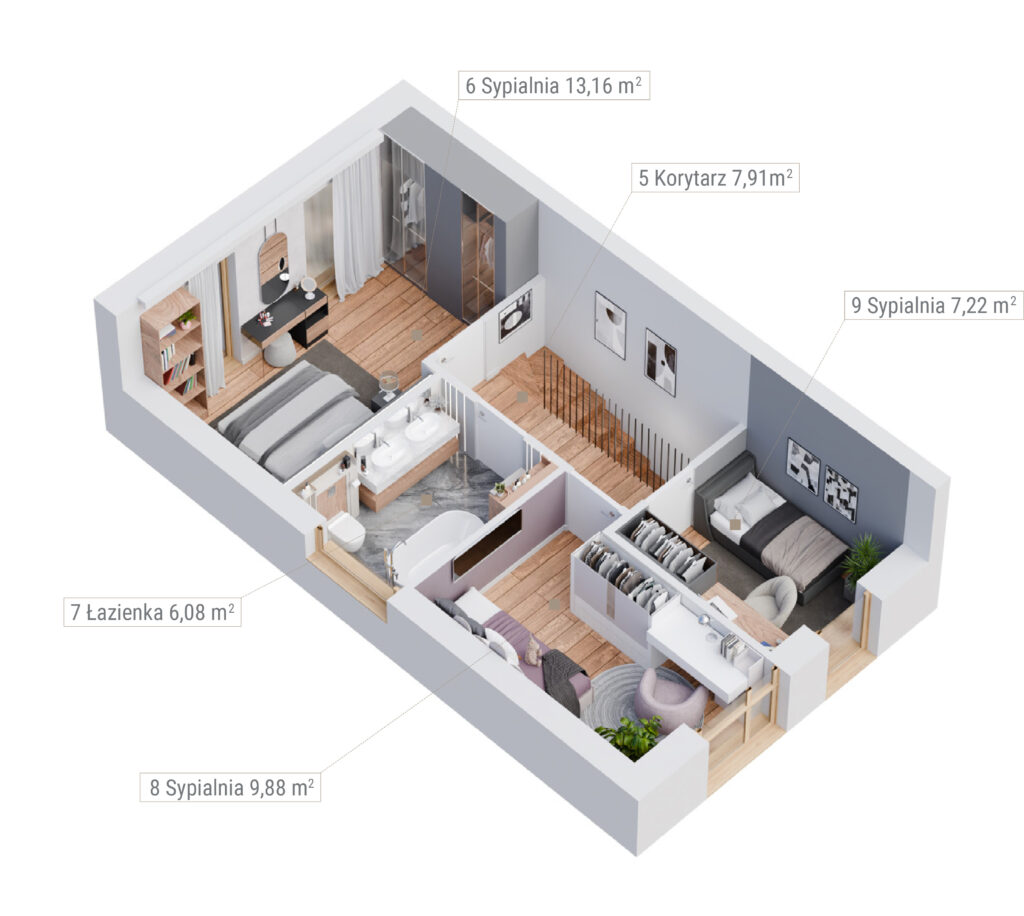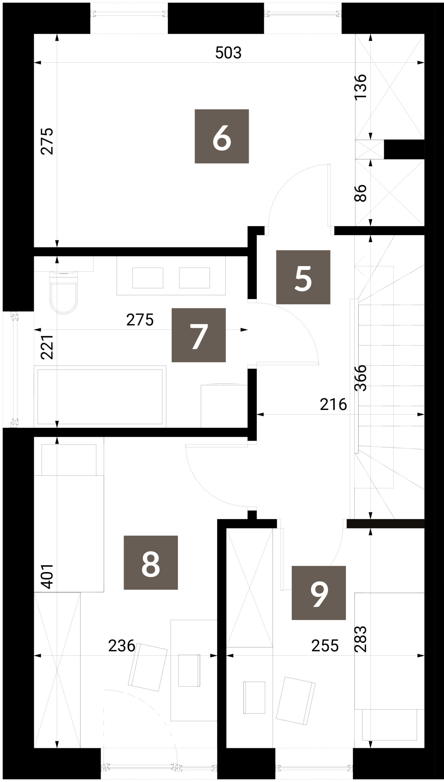 W środku znajdziesz przestronny salon z dużą kuchnią, 3 sypialnie, 2 łazienki a także pokój gościnny lub gabinet. Układ wnętrza można przearanżować i dostosować do swoich potrzeb – powiększyć strefę dzienną czy wydzielić dodatkowy pokój. Każdy dom posiada również funkcjonalne poddasze, które możesz zagospodarować według własnego pomysłu. Duże przeszklenia wpuszczają do wnętrz mnóstwo naturalnego światła, a wysokie pomieszczenia dają wrażenie jeszcze większej przestrzeni.